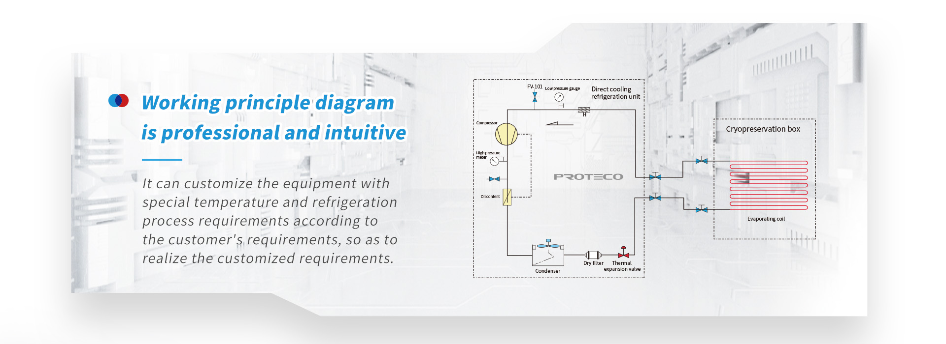The refrigeration system adopts a single compressor refrigeration and a two-stage cascade refrigeration method. And it is equipped with multiple protection functions to ensure the safe operation of the equipment. Through the refrigeration of the unit itself, the liquid low-temperature refrigerant is sent to the end evaporator for cooling, creating a low-temperature environment that meets the requirements of the process conditions.