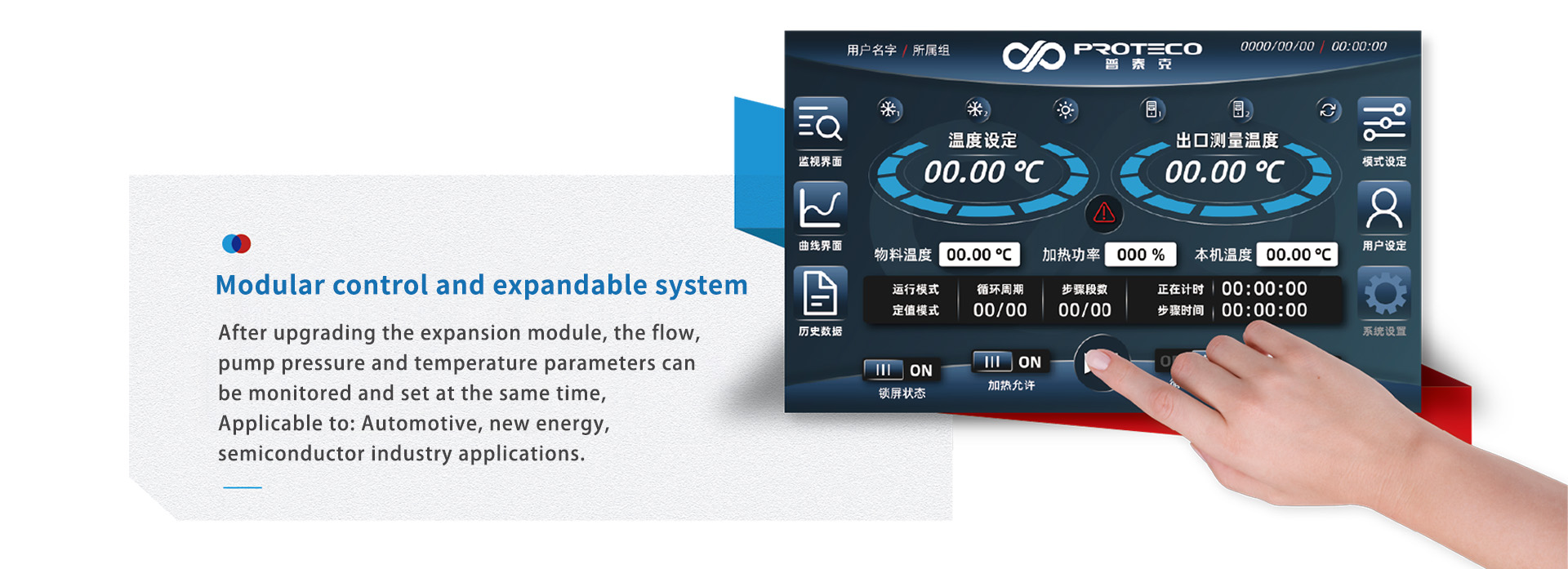 It mainly consists of heating circulation system, cooling system, control system, box, etc. The heating cycle system consists of a circulation pump, an electric heater, an expansion vessel, an exhaust valve, a one-way valve, a thermal resistor, and a circulation pipeline. The cooling system consists of oil-water heat exchangers, oil-oil heat exchangers (some equipment), cooling water solenoid valves, high-temperature solenoid valves, etc. The control system adopts PID control technology, high-definition touch screen display, and is equipped with multiple protection functions to ensure the safe operation of the equipment. By heating and cooling the unit itself, the heat carrying fluid is transported to the outside world to meet the requirements of the process conditions.